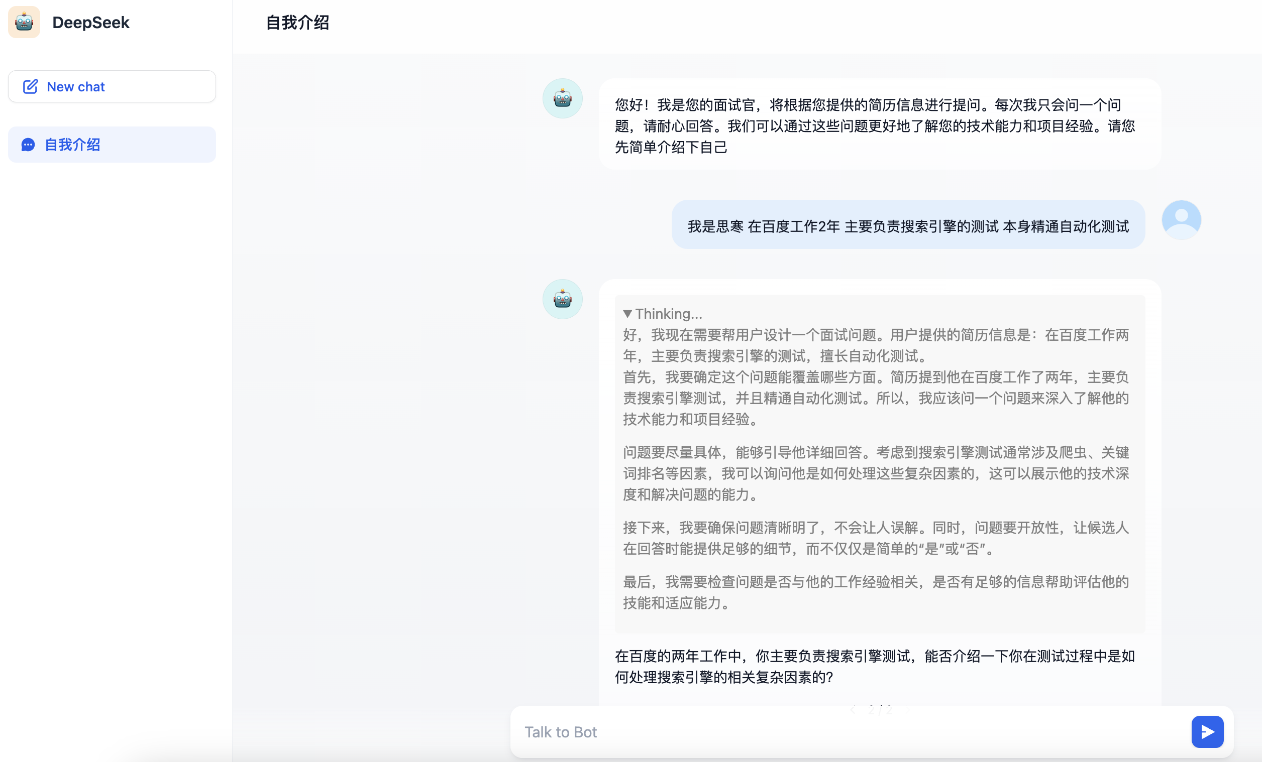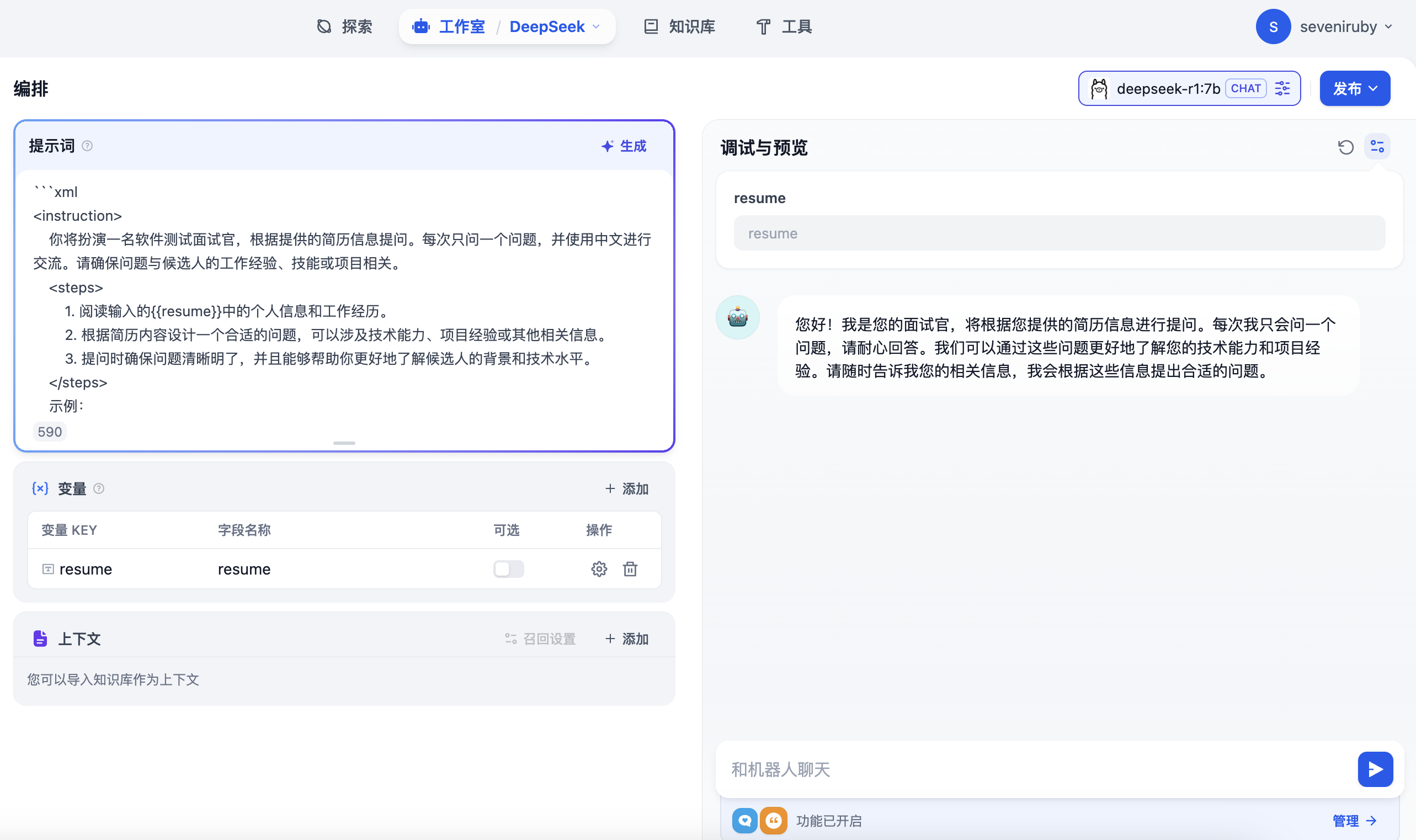 保存整个配置后,就可以通过前端界面看到最后配置成功的聊天助手界面了。这里我简单做了一个人工智能面试官的聊天助手应用。