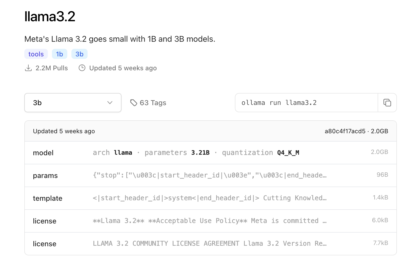 llama3.2:latest a80c4f17acd5 2.0 GB 3 weeks ago