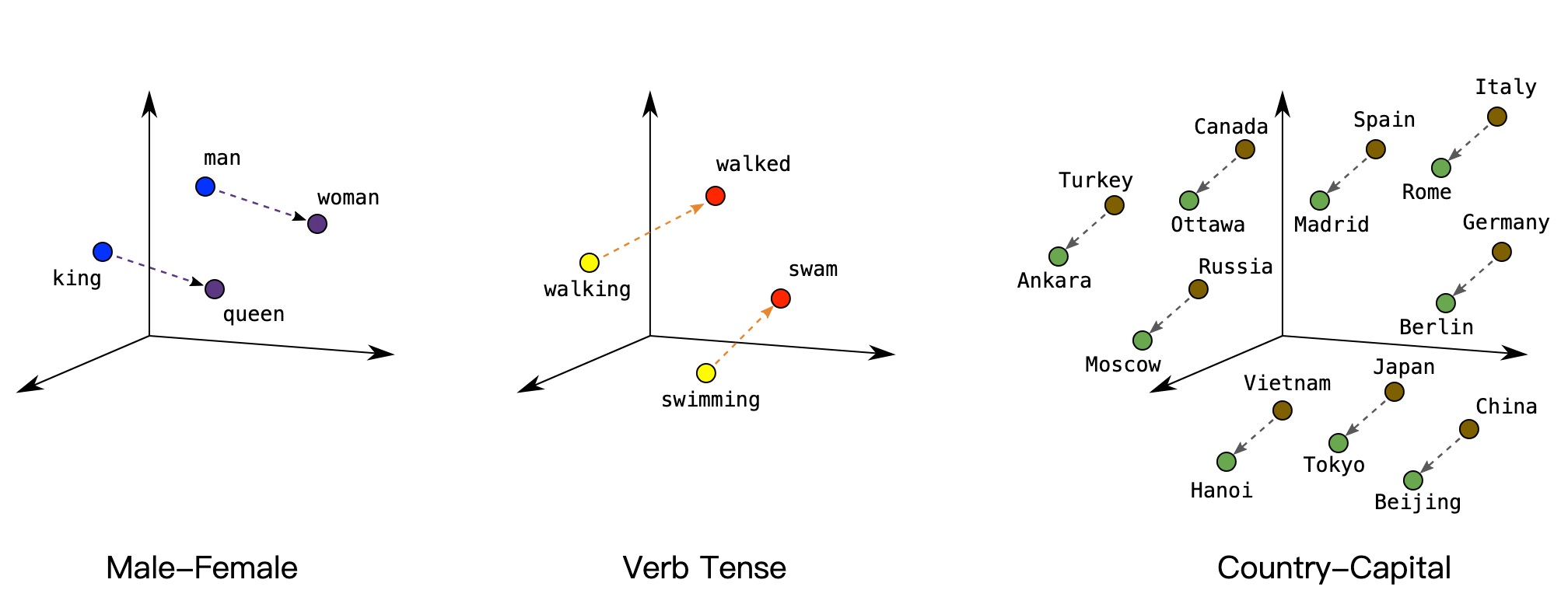 - Word Embedding:如 Word2Vec,将词转化为固定维度的向量表示。