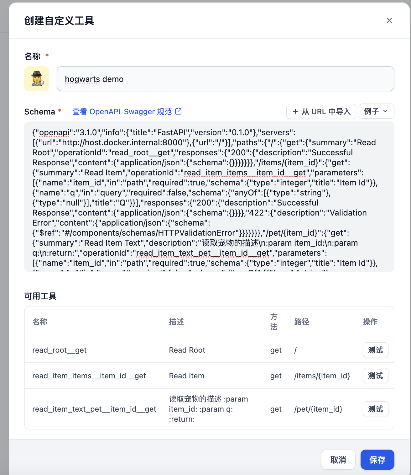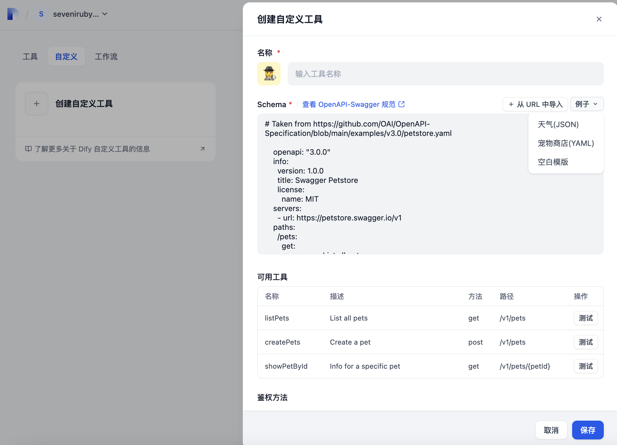 在“工具-自定义工具”内可以导入自定义的 API 工具,目前支持 OpenAPI / Swagger 和 ChatGPT Plugin 规范。你可以将 OpenAPI schema 内容直接粘贴或从 URL 内导入