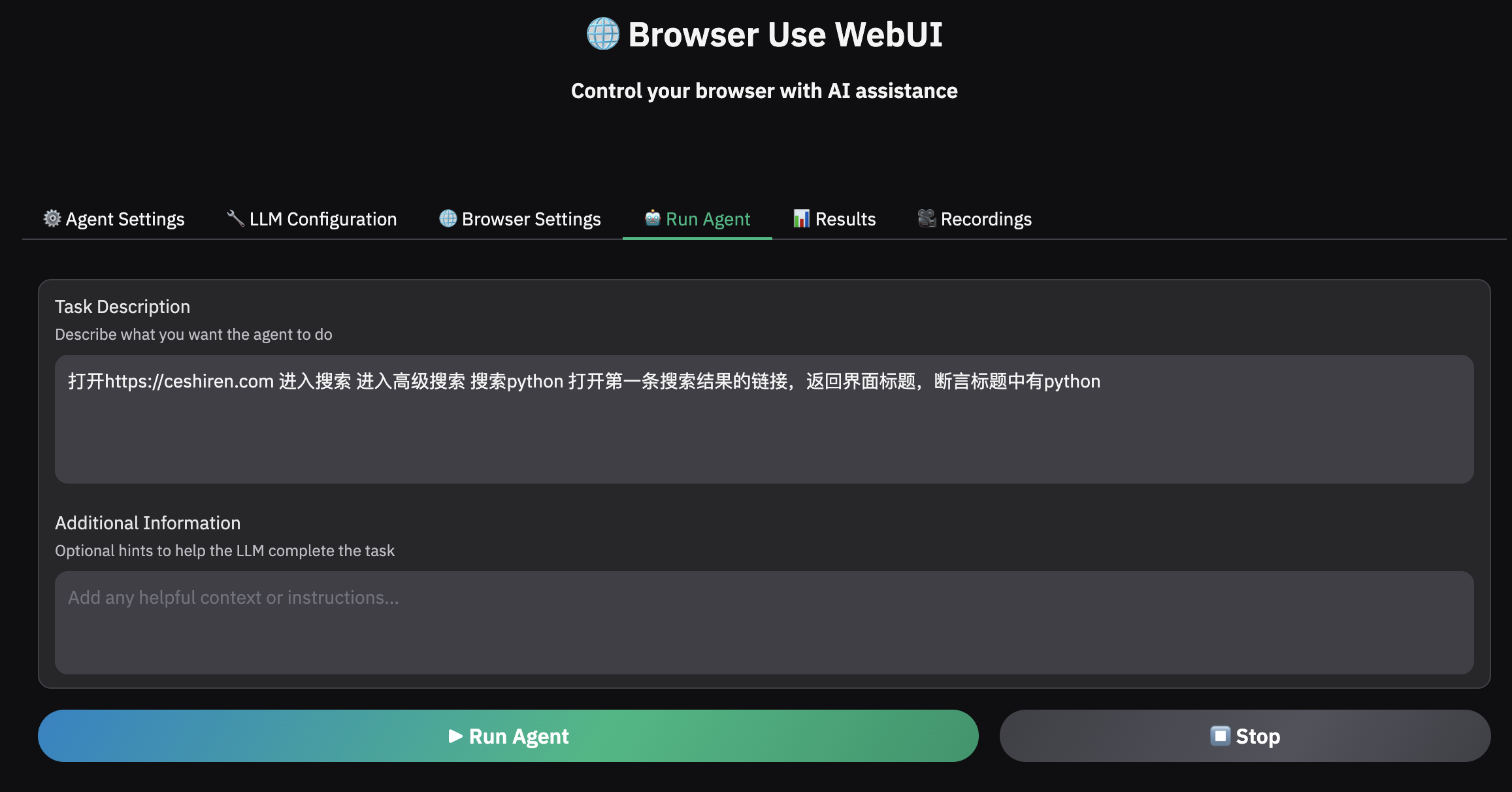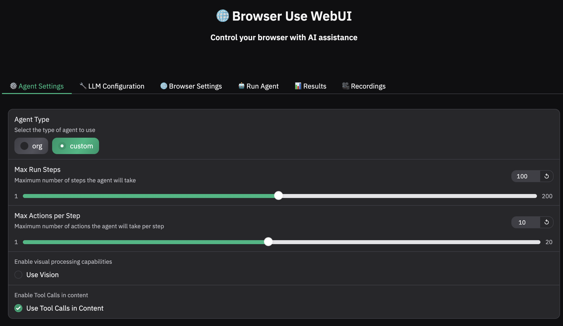 这是 browser use webui 的基本界面。 你可以通过这个界面配置浏览器的配置,配置大模型,并执行任务。 也可以查看执行结果与每次结果的录制数据。