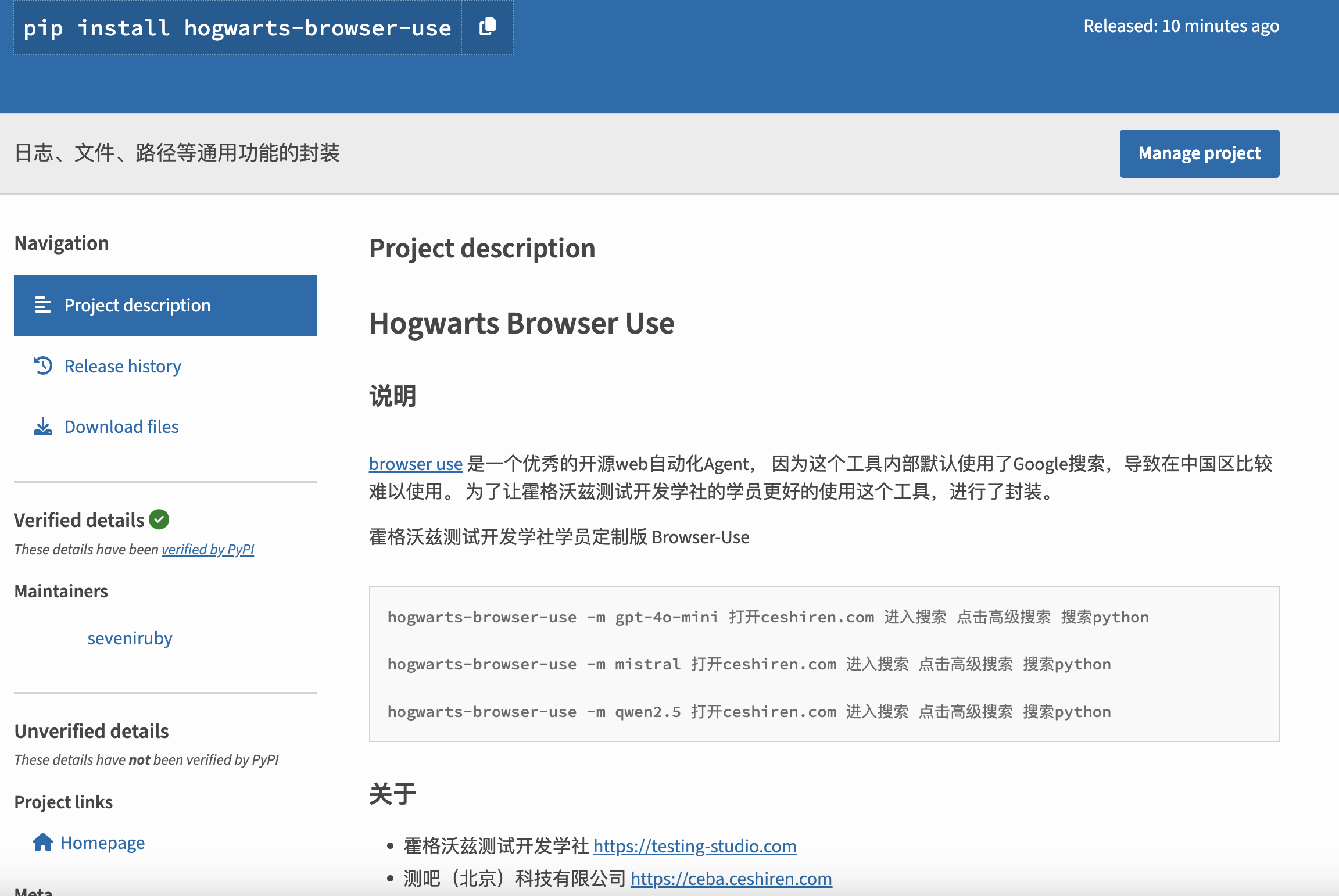 这是 hogwarts browser use 的一个使用效果。 可以通过 pip install 直接安装。 然后通过命令行用法先后执行百度搜索与测试人搜索。